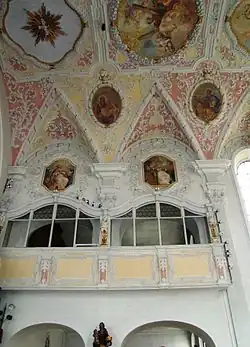 Die Emporen auf der Westseite befinden sich auf drei Ebenen, von denen die oberste durch die nach oben strebende Orgel geteilt wird. Die oberste Emporenbrüstung ist mit Stuck und kleinen Bildern geschmückt, die anderen haben nur Stuck als Verzierung.