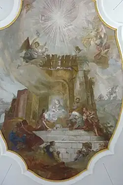 Das Deckenbild des Langhauses stellt die Geburt Christ dar und wurde 1908 von Jakob Huwyler geschaffen.