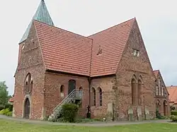 Die jetzige, durchgehend gewölbte, frühgotische Saalkirche aus Backstein stammt im Kern aus dem 13. Jahrhundert.[1] Von der Vorgängerkirche aus der Zeit um 1150 sollen noch die Sandsteinquader stammen, die später im unteren Bereich und an den Ecken der jetzigen Kirche eine neue Verwendung fanden. Um 1280 wurde die Backsteinkirche nach Norden erweitert durch die „olle Bichtkammer“ (Alte Sakristei) und erhielt um 1320 einen wuchtigen, quadratischen Turm mit einem hohen Zeltdach. Der Bau wurde 1521 durch die Neue Kirche erweitert, die der „ollen Bichtkammer“ (Beichtkammer) gegenüber angebaut wurde. Die Kirche erhielt dadurch ihren kreuzförmigen Grundriss. Im 19. Jahrhundert wurde die alte Sakristei zum Innenraum des Kirchenschiffs geöffnet und im Winkel zwischen ihr und dem Chor eine neue Sakristei angebaut.