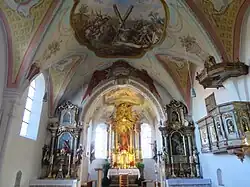 Die im Kern spätgotische Saalkirche wurde 1787 barock umgestaltet. Sie besteht aus dem Langhaus zu vier Jochen, dem eingezogenen, dreiseitig geschlossenen Chor im Osten, einem zum Portal führenden Vorbau an der Südwand des Langhauses, dem mit einem spitzen Helm bedeckten Chorflankenturm an der Südwand des Chors und der Sakristei an der Südostecke von Chor und Chorflankenturm, in deren Obergeschoss sich ein Oratorium befindet.