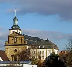 Der Grundgedanke für die 1729 bis 1739 von Johann Georg Stahl[1] erbaute Saalkirche geht wahrscheinlich auf einen Entwurf von Johann Michael Ludwig Rohrer zurück. Dem Langhaus ist im Osten ein Drei-Konchen-Chor angefügt. An der Nordwand des Langhauses steht vor der Konche der Kirchturm, der mit einer Zwiebelhaube bedeckt ist, die von einer Laterne gekrönt wird. In seinem Glockenstuhl hängen fünf Kirchenglocken.[2] Die Fassade im Westen, in der sich das Portal befindet, ist mit Pilastern gegliedert und schließt mit einem Tympanon ab, in dessen Nische eine Statue des Apostels Andreas steht.