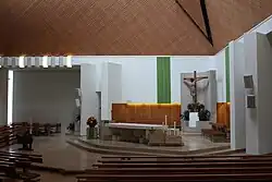 Der Innenraum der Kirche ist als Querbau gestaltet, wodurch die Gottesdienstbesucher nahe beim Altar sitzen können. Die Kirchenbänke sind im Halbkreis um den Altar gruppiert, wodurch dem Communio-Gedanken des Zweiten Vatikanischen Konzils räumlich Ausdruck gegeben wird. Die Wände der Kirche sind aus hell gestrichenem Beton. Über ihnen ragt das mit Holz verkleidete Kirchendach steil auf. Das Licht dringt durch ein Oberlicht im Kirchendach in die Kirche und taucht den Gottesdienstraum in je nach Sonneneinstrahlung und Tageszeit wechselndes Licht. Auf der Rückseite der Kirche sind ebenerdig weitere Fenster eingelassen, die den Raum zusätzlich erhellen.