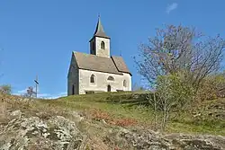 Die Kirche verfügt an der Außenwand über zwei steingerahmte Spitzbogentüren. Langhaus und Chor sind im Innenraum mit einem gotischen Kreuzgewölbe versehen. An der Seitenwand befinden sich ein in jüngerer Zeit freigelegter frühgotischer Freskenzyklus aus der Zeit des 15. Jahrhunderts mit der Darstellung des Heiligen Christophorus, Margarethe, Stephanus und Laurentius. Am Chorbogen steht die Jahreszahl 1592.