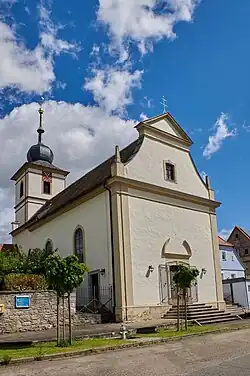 Der 1792 mit einer Zwiebelhaube bedeckte Kirchturm, der auf einen Chorturm aus dem 17. Jahrhundert zurückgeht, steht im Norden des eingezogenen Chors, an den sich nach Süden das Langhaus anschließt. Die Fassade im Süden ist mit Lisenen an den Ecken und einem Schweifgiebel versehen, der von einem Tympanon gekrönt wird. Die Kirchenausstattung, u. a. der Hochaltar, stammt aus der Hofspitalkirche in Würzburg. Das mit den Vierzehn Nothelfern bemalte Altarretabel hat Oswald Onghers 1682 geschaffen. Die Orgel auf der Empore hat 9 Register, 2 Manuale und ein Pedal und wurde 1915 von G. F. Steinmeyer & Co. gebaut.[1]