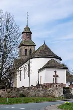 Der Kirchturm wurde erst 1923 nachträglich erbaut. Dies regte der Pfarrer Johannes Todt an, da zu dieser Zeit große Armut im Dorf herrschte. Dabei wurde der alte Dachreiter als Baumaterial wiederverwertet. Im Jahre 1941 wurden die bis dahin farblosen Fenster durch farbige Fenster ersetzt, die verschiedene Motive zeigen, wie den Erzengel Michael, wie er mit einem Drachen kämpft und noch weitere.