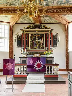 Zur Kirchenausstattung gehört ein breites Altarretabel von 1624 mit einem Gemälde eines unbekannten Malers über die Kreuzigung. Daneben sind links Martin Luther und rechts Philipp Melanchthon dargestellt. Links vor der Empore hängt ein Lutherbild, eine Kopie eines bekannten Gemäldes von Lucas Cranach.