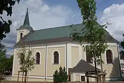 Der spätbarocke Kirchenbau besitzt einen rechteckigen, an den Ecken abgerundeten Grundriss mit nach Osten gerichtetem Altarraum. An der Südseite schließt sich in der Ecke zwischen Kirchenschiff und Altarraum ebenerdig die rechteckige Sakristei an. Das Mauerwerk besteht aus Bruchsteinen, die Dächer sind als Walmdächer ausgeführt und mit blecherner Dachhaut bekleidet. Am Ende des Dachfirstes befindet sich ein zweiarmiges Kreuz.