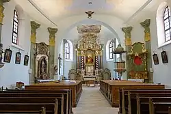 Das Innere des Kirchenschiffs ist mit einer Böhmischen Kappe überwölbt. Die glatt verputzte und um einem Deckenspiegel ergänzte Decke zeigt ein Gemälde mit Adler samt Böhmischen Wappen sowie darunter im Schild zwei Schlägel. Die Wände werden durch flache korinthische Pilaster mit reich verzierten Kapitellen zwischen den Fenstern geteilt. Die Öffnung zum zwei Stufen erhöht liegenden Altarraum ist mit einem halbkreisförmigen Bogen abgeschlossen. Im niedrigen Tonnengewölbe des Altarraums befindet sich ein Deckengemälde aus dem frühen 19. Jahrhundert, das die Jungfrau Maria mit Jesuskind sowie Heiligen zeigt.