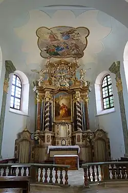 Am Abschluss das Chores befindet sich der Hauptaltar. Er ist aus Holz geschnitzt und grau- bzw. braunmarmoriert, 1912 wurde er letztmals neu bemalt. In der Mitte des Altars hängt auf Leinwand ein neuzeitliches Bildnis der Heiligen Familie. Zu beiden Seiten befinden sich Säulen mit vergoldeten korinthischen Kapitellen. Beiderseits dieser Säulen befinden sich spätbarocke geschnitzte Statuen der Heiligen Wenzel, Florian, Barbara und Katharina. In der sich zur Decke anschließenden Fortsetzung des Altars befindet sich eine Statuengruppe der Heiligen Dreifaltigkeit mit einer Erdkugel, links Jesus Christus, rechts Gott der Vater, darüber eine Taube als Symbol des Heiligen Geistes, begleitet von einer Engelschar.