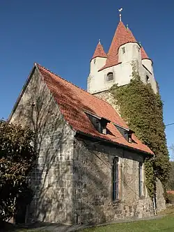 Der hochgotische zu zwei Dritteln efeubewachsene Chorturm der Pfarrkirche stammt aus dem Mittelalter, ist mit einem mittigen Spitzhelm sowie mit vier Ecktürmen versehen und macht einen sehr wuchtigen Eindruck. Hauptturm und Ecktürme tragen Kegelhauben. 1783 wurde der Turm nach einem Blitzschlag erneuert und bekam die mittelalterlichen Hauben wieder.