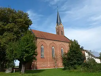 Die Kirche ist ein unverputzter Ziegelrohbau im Stil der romantischen Neugotik und wurde 1868 bis 1869 von Max Treu errichtet.