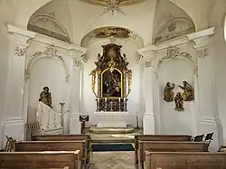 Das unsignierte Altarbild (von Kirzinger?) stellt Mariä Opferung dar, wo Anna ihre Tochter dem Hohenpriester zum Tempeldienst übergibt; rechts vorne kniet Mariens Vater Joachim. Das Motiv geht zurück auf eine Legende im Protoevangelium des Jakobus. Über dem Altarretabel sieht man das Wappen des Augustinerchorherrenstifts Dießen, darüber das Auge Gottes im Strahlenkranz.[1]