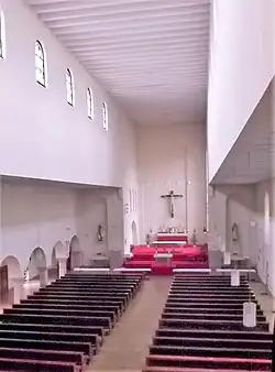 Man betritt das Kirchenschiff über einen mächtigen Turm mit querrechteckigem Grundriss auf der Westseite. In den drei wandhohen Nischen befinden sich die Schallfenster der Glocken und im Erdgeschoss die einfachen Glastüren. Vor dem mittleren Schallfenster hängt eine Uhr. Man betritt eine Turmvorhalle mit dem Taufbecken, die durch Rundbögen mit rechteckigen Glastüren vom Langhaus getrennt ist. Das vierschiffige Langhaus bildet eine pfeilerlose Basilika mit flachen Decken mit Querrippenraster. Über dem Eingang sitzt eine Empore mit Orgel. In den Obergaden sitzen Rundbogenfenster. An das Seitenschiff auf der Südseite ist ein niedrigeres Seitenschiff angebaut, das durch rundbogige Arkaden vom Hauptraum abgetrennt wurde. Auf der Westseite ist eine bandartige Öffnung über den Arkaden, über die man die balkonartige Kanzel betritt. Rundbogenfenster mit abstrakten Motiven aus Buntglas erhellen das Kircheninnere und wurden 1957 von Reinhard Heß und 1964 von Pater Bonifatius Köck geschaffen. Die Wände sind innen weiß verputzt und der Boden mit hellen Keramikfliesen belegt.