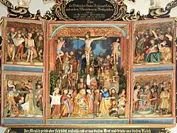Die mittelalterlichen Malereien der Innen- und Außenflügel sind nicht erhalten. Bei der barocken Aufarbeitung des Retabels wurden 1654 die Flügel festgestellt und das gesamte Retabel samt Predella mit einem Knorpelwerkrahmen umgeben. Für die Schnitzarbeiten wurde Claus Heimen beauftragt, der kurz zuvor im Auftrag von Alexander Dresscher das große Epitaph für dessen Familie geschaffen hatte.[9] Der Altar ist deshalb nicht klappbar. Die damals mit Szenen aus der Kindheit Jesu neu bemalten Gemäldeflügel wurden später abgenommen und nördlich des Chorbogens aufgehängt. An diese Renovierung erinnert eine Stiftungsinschrift in einer Kartusche über dem Mittelschrein, die mit dem Pantokrator bekrönt ist. Diese Inschrift wurde ebenso wie die Texte auf der Predella bei weiteren Renovierung 1738, 1797 und 1857 überschrieben. Bei der Restaurierung durch Botho Mannewitz 1981/82 wurde die Fassung von 1797 wieder freigelegt, zu der auch der bewölkte Himmel als Hintergrund der Kreuzigung gehört. Nur die Predella mit den Einsetzungsworten blieb im Zustand von 1857.[10]