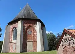 Die spätgotische Saalkirche aus Backsteinen wurde um 1400 errichtet. Sie besteht aus einem Langhaus und einem gleich breiten Chor mit Fünfachtelschluss von 1558, der 1657 vergrößert wurde.[4] Die Nordwand ist fensterlos. Das Dach ist mit Schieferschindeln gedeckt.