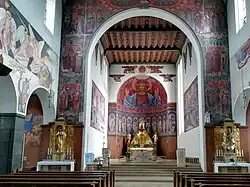 Im Inneren fällt neben den zahlreichen Gemälden die Christusdarstellung in der Apsis ins Auge. Sie wurde geschaffen vom Regensburger Künstler Georg Winkler, der in Zusammenarbeit mit Geistlichen und mit dem in Regensburg ansässigen Holzbildhauer Guido Martini das künstlerische Gesamtkonzept der Kirche und die Entwürfe für den Hochaltar und die Buntglasfenster erstellte. Winkler erschuf von 1928 bis 1938 die Fresken als Mineralmalereien, deren Bilderfolgen zwar traditionell gestaltet sind, jedoch durch Verbindungen mit zeitgenössischen Darstellungen auch ganz eigene Akzente haben. Der Hochaltar wurde von Haber & Brandner gefertigt, die Bildhauerarbeiten wurden von Guido Martini gestaltet. Die Glasmalereien stammten von den beiden Regensburger Firmen Schwarzmeyer und Schneider. Die Buntglasfenster sind nicht erhalten. Sie wurden Opfer eines Bombenangriffs am Ende des Zweiten Weltkriegs.