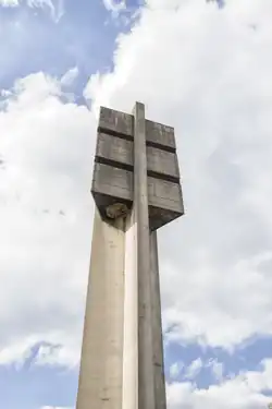 Der Glockenturm steht als Campanile leicht abseits des Gebäudes. Er besteht aus drei kreuzförmig angeordneten Betonstreben, die eine dreieckige Glockenstube aus waagerechten Betonbändern tragen.