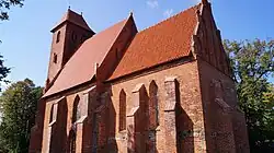 Der Chor ist ein eingezogener, nachträglich gewölbter Rechteckchor auf vortretendem Sockel. Bemerkenswert die diagonal stehenden Strebepfeiler an den Seiten, während die Kanten ohne Streben bleiben. Die fächerartige Stellung der Streben am Chor zeigt eine formale Verwandtschaft mit der Lösung am Chor von St. Jakob in Thorn. Zwischen den Strebepfeilern hat der Chor schmale, lanzettartige Fenster mit schräger Leibung. Das jüngere Langhaus hat dagegen hochliegende und profilierte Fenster. Merkwürdig ist die späte Verwendung des wendischen Verbands.
