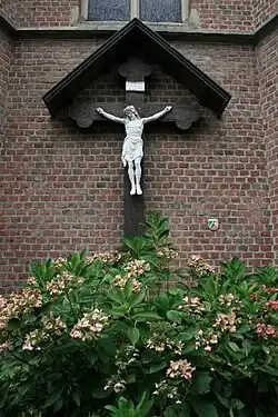 An der Außenseite des Chorraumes sind ein denkmalgeschütztes Missionskreuz sowie zwei alte Grabsteine angebracht. Dort wurde 1989 ein Terrakotta-Korpus einer Christusdarstellung aus dem 18. Jahrhundert gefunden, der heute im Sakralmuseum in der Paterskirche Kempen gezeigt wird.[1]