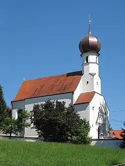 Die barocke Saalkirche wurde 1666 nach einem Entwurf von Hans Kogler errichtet. Sie besteht aus dem Langhaus und dem eingezogenen, dreiseitig geschlossenen Chor im Nordosten, an den eine Sakristei angebaut ist. Aus dem Narthex (Vorhalle) im Südwesten des Langhauses, in dem sich das Portal befindet, erhebt sich der Kirchturm mit achteckigen Obergeschossen und abschließender Zwiebelhaube.