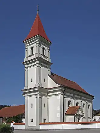 Die barocke, mit Pilastern gegliederte Saalkirche wurde 1720 nach einem Entwurf von Anton Kogler erbaut. Sie besteht aus einem Langhaus, einem eingezogenen, halbrund geschlossenen Chor mit der Sakristei im Osten und dem Fassadenturm im Westen, dessen oberstes Geschoss den Glockenstuhl beherbergt und der im 19. Jahrhundert mit einem hohen Pyramidendach bedeckt wurde.
