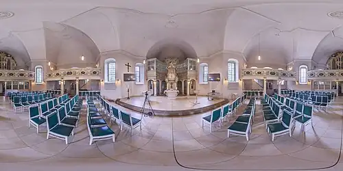 An der Nord- und Südseite des Innenraumes wurden Emporen aus Holz angebracht, die über gewundene Treppen erreichbar sind. Die vorherrschenden Farben sind weiß, lindgrün und gold und verziert sind sie mit Sprüchen aus der Bibel und Sinnbildern. Auf ihnen sind noch die ursprünglichen Holzbänke vorhanden, die während der Renovierungsarbeiten in den 70er Jahren des 20. Jahrhunderts entfernt wurden.