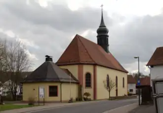 Die heutige Pfarrkirche wurde 1751 unter dem Fuldaer Bischof Amand von Buseck errichtet. Gegen Ende des Zweiten Weltkriegs wurde sie am 31. März 1945 durch Artilleriebeschuss US-amerikanischer Truppen größtenteils zerstört und brannte mit Inventar aus. Ein Wiederaufbau unter Beibehaltung der verbliebenen Bausubstanz (die Außenmauern) erfolgte 1948–1949. Eine neue Sakristei wurde später an die dreiseitige Chorwand angebaut. Neben der Kirche vor der Sakristei befindet sich ein Gedenkstein, der an die Schäden an der Kirche und im Dorf im Zweiten Weltkrieg erinnert.