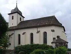 Die Gemeinde wurde in der zweiten Hälfte des 9. Jahrhunderts gegründet und eine Vorgängerkirche wurde 1173 erstmals erwähnt. Die heutige Kirche, ein dreijochiger Saal aus verputztem Bruchstein schließt mit einem dreiseitigen Chor. Das Ostjoch ist kürzer. Der Bau wird durch Strebepfeiler gestützt, der Westturm unter einer geschweiften Haube ist eingebaut und mit 1710 bezeichnet. Die Kreuzrippengewölbe mit Gurtbögen ruhen auf rechteckigen Vorlagen mit profilierten Kämpfern.