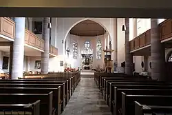 Im Zweiten Weltkrieg brannte die Kirche total aus; sie wurde 1943 bis auf die Umfassungsmauern des Chors und Reste der Langhauswände zerstört. Die Kirche wurde in den Jahren 1955/56 unter Regierungsoberbaurat Gottlieb Schwemmer durch Neubau eines dreischiffigen Langhauses in enger Anlehnung an den Vorgängerbau, aber mit verändertem Innenraum, wieder aufgebaut. Der Langhaussaal wird überspannt von einer hölzernen Flachdecke.[1]