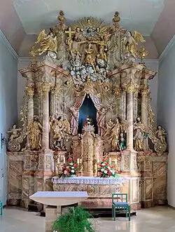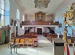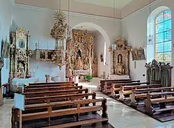 Die heutige Saalkirche geht im Wesentlichen auf die Erweiterungen von 1823/24 zurück. Nur die Sakristei und die zwei unteren Geschosse des Chorturms sind von der ursprünglichen gotischen Kirche erhalten. Der Chorturm ist gegenüber der Längsachse des Langhauses nach Süden verschoben, nachdem das Langhaus nach Norden verbreitert wurde. Das oberstes Geschoss, das die Turmuhr und den Glockenstuhl beherbergt, und den achtseitigen, schiefergedeckten Knickhelm erhielt der Chorturm 1823/24. Die Innenräume des Langhauses und des Chors sind mit Flachdecken überspannt. Zur Kirchenausstattung gehören der Hochaltar aus der 2. Hälfte des 18. Jahrhunderts, die Seitenaltäre aus der 2. Hälfte des 17. Jahrhunderts und die Kanzel von 1766/67. Die Orgel mit 12 Registern auf zwei Manualen und Pedal wurde 1992 von Orgelbau Eisenbarth errichtet.[1]