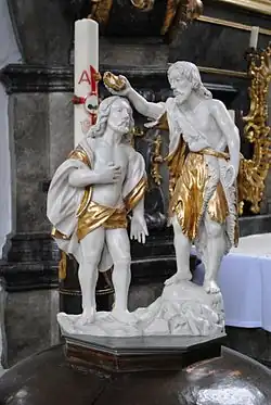 Der Taufstein von 1559 weist im Sockel die Wappen Fürstbischofs Friedrich von Wirsberg, der Stadt Volkach und der Gotteshauspfleger Johann Schwan und Cunz Rücker auf. Mehrere Reliefs zeigen die Taufe Christi, seine Mutter Maria, den auferstandenen Welterlöser und die die Zwölf Apostel. Eine Figurengruppe aus Holz stellt die Taufe Christi dar. Sie wurde wohl um das Jahr 1750 für die barocke Erneuerung der Kirche geschaffen.