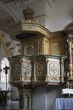 - Die Doppelkanzel aus grün-gelb marmoriertem Holz gehörte vermutlich ebenfalls zum Inventar des 1803 aufgelösten Klosters Taxa. Um 1900 wurde sie mit ihrem heutigen vergoldeten Schnitzdekor versehen, unter dem Intarsien aus verschiedenen Hölzern und Zinn aus der zweiten Hälfte des 17. Jahrhunderts teilweise freigelegt wurden.