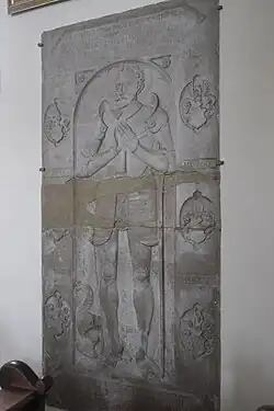 Die Grabplatte aus Solnhofener Plattenkalk ist an der Südwand des Langhauses angebracht. Der darauf in Relief dargestellte Ritter hält einen Rosenkranz in der Hand, zu seinen Füßen liegt der Helm seiner Rüstung als Zeichen seines Todes. Am Rand sind sechs Wappen und oben ein lateinischer Vers eingemeißelt, unten ist die Signatur „C. Senft. f.“ zu lesen.