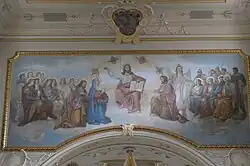 Das große Gemälde an der Wand über dem Triumphbogen stellt Jesus dar, der, umgeben von Aposteln, Heiligen und Märtyrern, auf einer Wolke thront. In der linken Hand hält er ein geöffnetes Buch, auf dem die Buchstaben Alpha und Omega zu lesen sind. Zu seiner Rechten knien Maria und Joseph, der eine weiße Lilie in der Hand hält, zu seiner Linken ist Johannes der Täufer zu erkennen, hinter dem der Erzengel Michael steht.