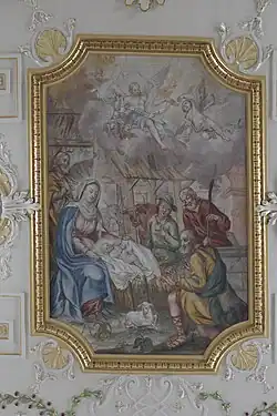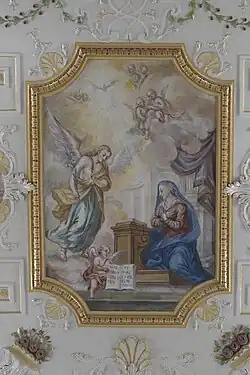 Die beiden großen Deckenfresken im Langhaus stellen die Verkündigung und die Anbetung der Hirten dar. Auf den kleineren, von Stuckkartuschen gerahmten Medaillons sind die Vermählung von Maria und Joseph dargestellt, die Heimsuchung, die Präsentation Jesu im Tempel und der zwölfjährige Jesus unter den Schriftgelehrten.