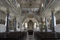 Der Innenraum ist seit dem Umbau in den 1890er Jahren als dreischiffige Säulenbasilika gestaltet. Das Langhaus ist in fünf Achsen gegliedert. Die Flachdecken der Seitenschiffe werden von massiven Säulen getragen, die mit vergoldeten Kapitellen im korinthischen Stil und profilierten Kämpfergesimsen ausgestattet sind.