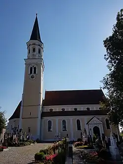 Während des Dreißigjährigen Krieges wurde die gotische Vorgängerkirche zerstört und anschließend im Stil des Barock wieder aufgebaut. Um 1730 wurde das Kirchenschiff erneuert und im Stil des frühen Rokoko mit Stuck und Fresken ausgestaltet und neu eingerichtet.