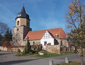 Im Turm befinden sich neben der mechanischen Uhr von der Firma Weule drei Glocken. Zwei der Glocken entstammen der Werkstatt des „Halleschen Gießers“, sie wurden 1503 bzw. 1522 gegossen. Die kleinste Glocke wurde 1996 von der Glockengießerei Lauchhammer gegossen. Sie ergänzt die Disposition zu es′-f′-b′. Alle Glocken hängen an geraden Jochen samt elektrischen Läutemaschinen.