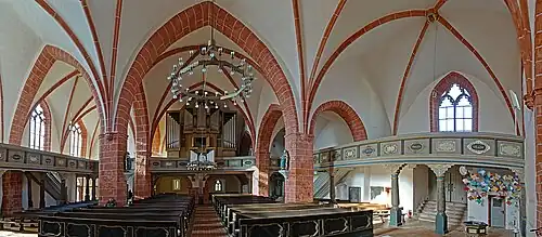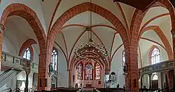 Dem nur zweijochigemLanghaus mit 27,2 Metern entspricht ein Querschnitt von 26,2 Metern, sodass von einer Kreuzkirche gesprochen werden kann.