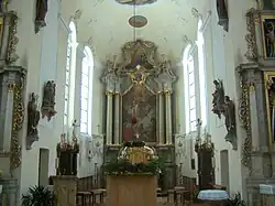 Über dem Chorbogen befindet sich das Wappen von Abt Beda, ein silberner Pelikan in blauem Grund. Über dem Hochaltar befindet sich das Wappen des aus Konstanz stammenden Abtes Cölestin. Das Hochaltarbild mit der Verherrlichung des Hl. Blasius stammt von Bergmüller, ebenso wie die vier Evangelistenbilder der Kanzel.