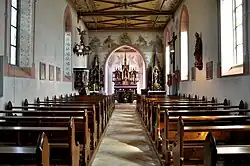 Der Innenraum ist mit einer Kassettendecke überspannt. Die Kirchenausstattung stammt aus der Bauzeit, die Kanzel wurde allerdings in der Mitte des 18. Jahrhunderts gebaut. Die Orgel wurde 1989 von Martin Gegenbauer in einen vorhandenen Prospekt eingebaut.