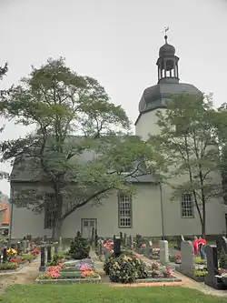 Die schlichte, schiefergedeckte Saalkirche wurde 1713 erbaut. Der massige Kirchturm im Osten ist im Kern mittelalterlich. Er erhielt eine bauchige, achtseitige Haube, auf der eine offene Laterne sitzt. An den Turm wurde nach 1830 eine Sakristei nach Osten angebaut. Das Kirchenschiff hat an drei Seiten Emporen, im Westen ist sie zweigeschossig. Es ist mit einem verputzten, hölzernen Tonnengewölbe überspannt. Der barocke Kanzelaltar hat zwei Zonen, die untere mit korinthischen Säulen, die obere hat einen ausschwingenden Kanzelkorb mit seitlichen Voluten. Das Altarbild, um 1800 gemalt, zeigt Jesus und die Samariterin. Das achtseitige Taufbecken von 1847 mit spätgotischem Fuß und großer Kuppa, stammt aus der Kapelle der Festung Heldrungen. Die Orgel hat 19 Register, verteilt auf 2 Manuale und Pedal.[2] Sie wurde in der 2. Hälfte des 19. Jahrhunderts von Friedrich Gerhardt Orgelbauer gebaut.[3]