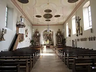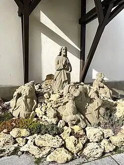 Ursprünglich war die Kirche von einer Gadenanlage und dem Kirchhof (= Friedhof) mit der Kirchhofmauer umgeben. Wohl um 1760 ersetzte man südlich der Kirche diese Gaden, und zwar durch ein repräsentatives Tor (das „Schwarze Tor“), dessen Pfosten von Figuren des Hl. Michael und der Immaculata bekrönt waren, und durch eine Balustradenanlage aus Sandstein, die bis zum Pfarrhaus reichte. Sie war mit Inschriften zur Leidensgeschichte Jesu versehen und ebenfalls mit Sandsteinfiguren bzw. -vasen geschmückt. Aufgrund von Verwitterung musste diese Anlage nach 200 Jahren abgetragen werden, wurde aber 2021 durch eine Konstruktion aus Muschelkalk ersetzt, welche das alte Erscheinungsbild vereinfacht wiederaufnimmt. Gut erhalten ist dagegen die barocke Ölberggruppe an der Südfassade der Pfarrkirche, die aus derselben Zeit (um 1780) stammt. Sie zeigt den betenden Jesus am Ölberg und drei schlafende Jünger fast lebensgroß. Hier und nördlich der Kirche hat man einige Grabsteine verdienter Bürger aufgestellt, z. B. den des Ehrenbürgers Pfr. Joseph Schmitt.