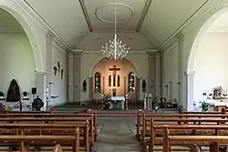 Das Langhaus mit Satteldach weist ein etwas niedrigeres Querschiff auf. Die Langseiten werden durch Lisenen gegliedert, die in ein Fries enden. Rundbogenfenster belichten das Innere. Der polygonale Chor ist ebenfalls etwas niedriger als der restliche Baukörper. Die Bleiglasfenster des Chors sind im Originalzustand erhalten und zeigt teilweise figürliche Darstellungen.[2]