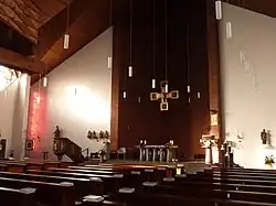 Die Kirche von 1886 wurde im Jahr 1963 durch eine große moderne Kirche ersetzt, die an der Chor- und Eingangsseite jeweils zwei halbrunde hohe Apsiden besitzt. Das Langhaus besitzt ein großes, gefaltetes Satteldach. Der romanische Turm steht frei an der Seite der neuen Kirche.