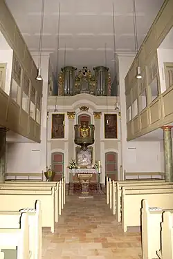 Der mit einer Flachdecke überspannte Innenraum hat doppelstöckige Emporen an drei Seiten. An den Längsseiten befinden sich Patronatslogen. Die Kirchenausstattung stammt aus der Bauzeit. In der Sakristei befindet sich eine nachträglich aus gotischen Statuen zusammengestellte Kreuzigungsgruppe. Die Orgel steht auf einer Empore über der Kanzel. Sie hat 24 Register auf zwei Manualen und Pedal und wurde 1911 von G. F. Steinmeyer & Co. gebaut.[1]