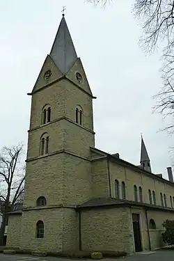 Die Ausrichtung des Gebäudes ist nicht wie üblich in der traditionellen Ost-West-Richtung, sondern in Nord-Südlicher Achse, wobei der Turm dem Südgiebel vorgesetzt ist. Die genordete Basilika aus Grünsandstein mit einem außen gerade geschlossenen Chor wurde 1821 erbaut. Baumeister war der preußische Bauinspektor Ernst Vincenz Plaßmann. Der Westturm ist eingezogen, auf dem Dach sitzt ein Dachreiter. Der Turmhelm wurde 1877/78 aufgesetzt.