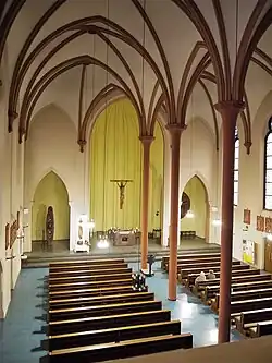 Das Kirchenschiff bietet Platz für etwa 1200 Personen, davon können ca. 300 sitzen. Die zweischiffige symmetrische Halle hat ein Kreuzrippengewölbe, das auf vier schlanken Säulen im Mittelgang und auf Konsolen an den Wänden ruht. Der Altarraum mit herzmuschelförmiger Apsis ist seitlich durch zwei Kapellenräume begrenzt. An der Wand des Kirchenschiffs zur Hofseite befindet sich ein Seiteneingang. Die Beichtstühle wurden in Wandnischen eingelassen, um in den schmalen Seitengängen mehr Platz für die Gottesdienstbesucher zu haben. Hinter dem Portal liegt der Kirchenvorraum, durch zwei Arkadenbögen vom Kirchenschiff abgegrenzt, seit März 1980 mit Glastüren versehen. Rechts neben dem Kirchenvorraum befindet sich die Marienkapelle mit einem verschließbaren Gitter zum Kirchenschiff, links die zum Kirchenschiff offene Taufkapelle. Über dem Vorraum und den beiden Kapellen erhebt sich die Empore für die Orgel.