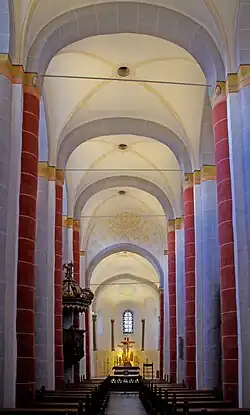 Die Mauern der bisherigen Kirche wurden in die Höhe gezogen. Starke Pfeiler tragen seither ein Gewölbe. Es handelt sich um ein Kreuzgewölbe mit Graten. Durch den Anbau von Seitenschiffen wurde die bisherige Kirche zum Mittelschiff. In den Seitenschiffen gibt es jeweils eine Wandapside. Ein Querhaus ist nicht vorhanden. Später wurde der Chorbereich angebaut. Dieser ist einjochig und in Kleeblattform. Die Kalotte des Chores wird von vier Säulen aus Kalksinter (Aquäduktenmarmor) gestützt. Die Fenster und Eingänge sind rundbogig und wurden später teilweise erweitert. Es handelt sich insgesamt um eine dreischiffige, fünfjochige Pfeilerbasilika.