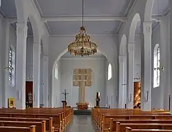 Der Kircheninnenraum ist mit flacher Decke überspannt. Die Decke wird an jeder Seite von vier Pfeilern mit Rundbögen getragen. Von der Decke hängt zentral ein großer Kronleuchter herab. Langhaus und Chor sind durch einen Triumphbogen voneinander getrennt. Das Gestühl, die Orgel sowie der Taufstein stammen von der Vorgängerkirche. Der Hochaltar zeigt eine überlebensgroße Christusstatue, die vom Bilderhauer Josef Vollmar gestaltet wurde.